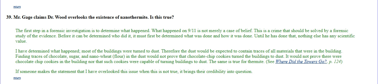 Thermite is discussed elsewhere, in depth. Why does Mr. Gage reference a page that does not discuss thermite in depth? Is it to be deceptive? If someone goes to page 126, they won’t find much of a discussion about thermite. So by referencing page 126, Mr. Gage is being deceptive and dishonest.