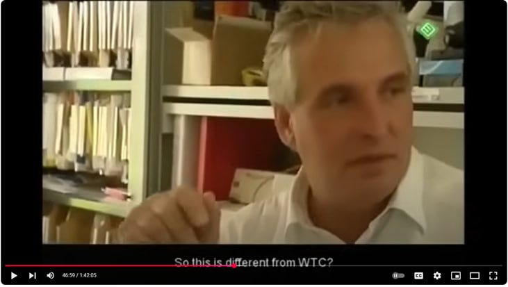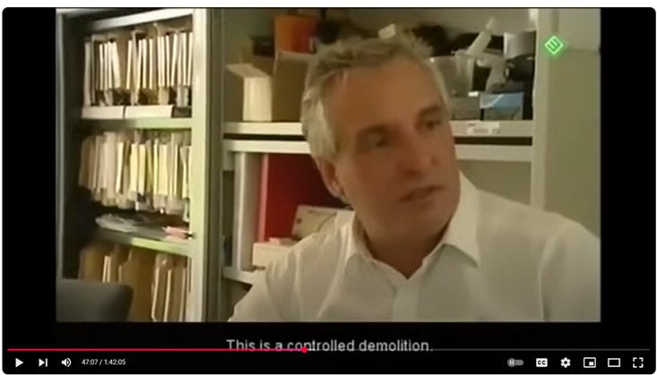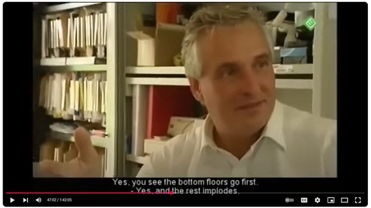 Daniele Ganser: Now I can't solve this riddle for you, OK, It's either fire or controlled demolition, and you have to think for yourself. As historians, we observe that politicians, very powerful politicians, tell us not to ask these questions.