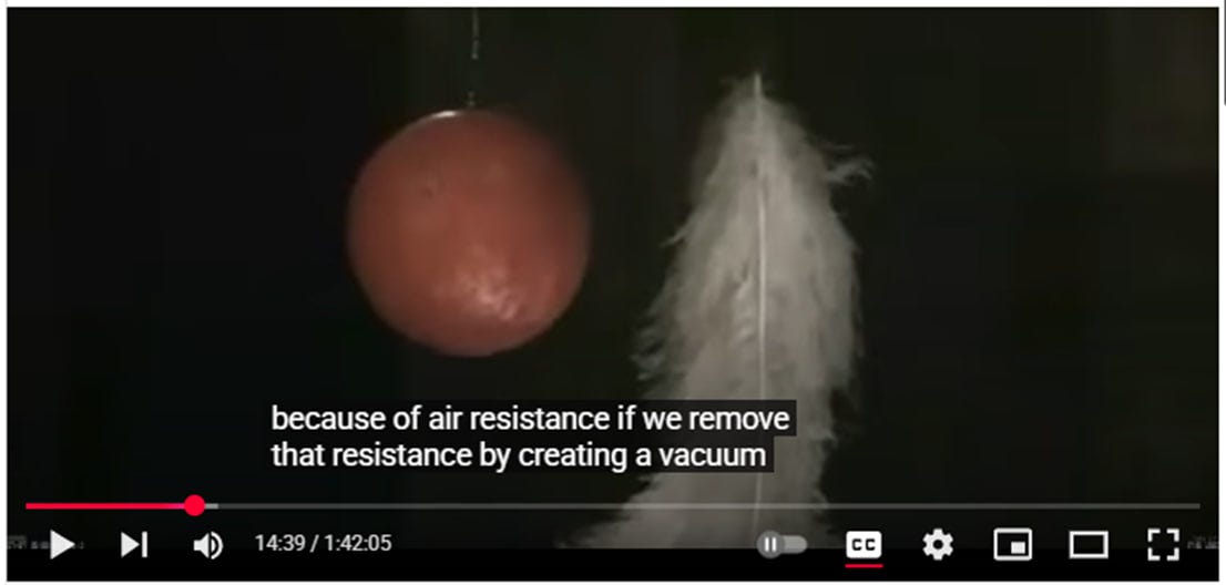This huge NASA vacuum chamber, the world's biggest. Both the feather and the ball drop at the same rate of true freefall. Freefall is only possible when there's absolutely no resistance. Zero resistance acting against the fall.