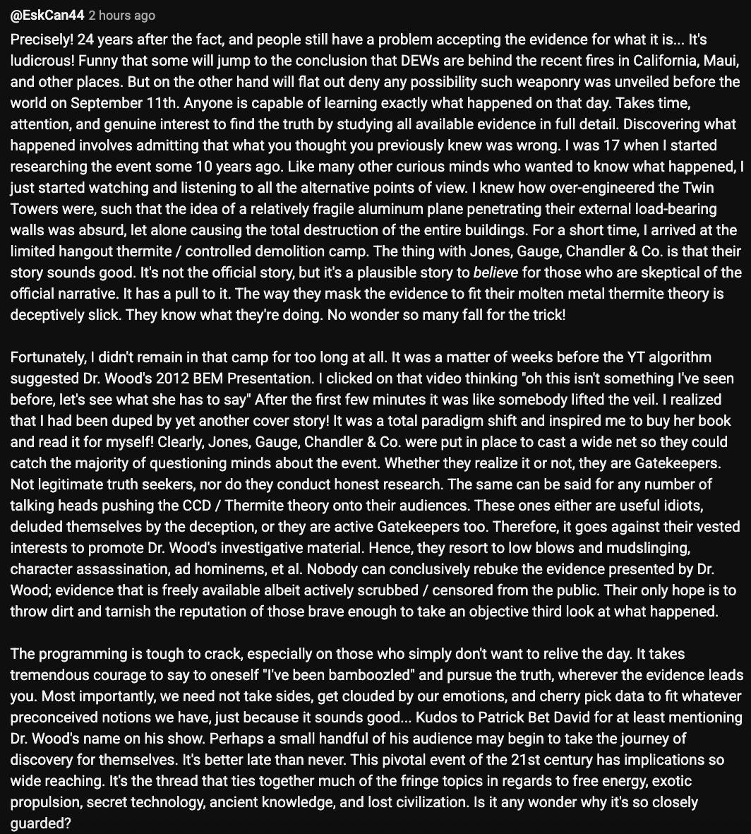 Let’s hear from Brandon Aceto, Head of Research for Valuetainment & the PBD Podcast, after he had worked through the evidence presented by Dr Wood, in her book, Where did the towers go? for his book club. (4 min clip) (Full 30 minute review here and here)