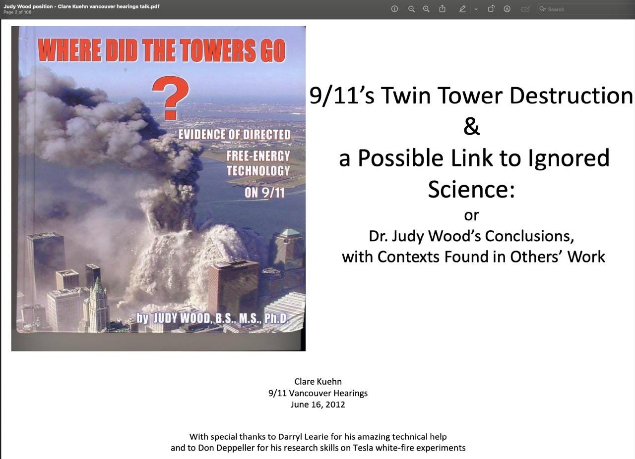 MES was also sent a 108 page power point presentation, by John Hutchison, delivered to the 2012 Vancouver 9/11 hearings, discussing the connection between Dr. Judy Wood's work on 9/11, John Hutchison and Nikola Tesla, presented by Clare Kuehn.