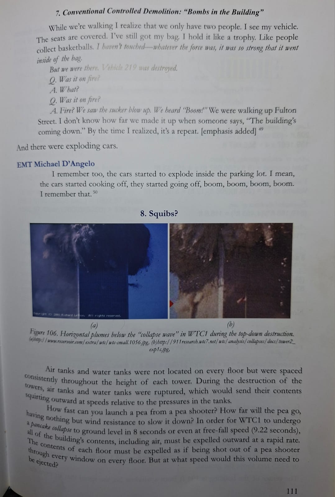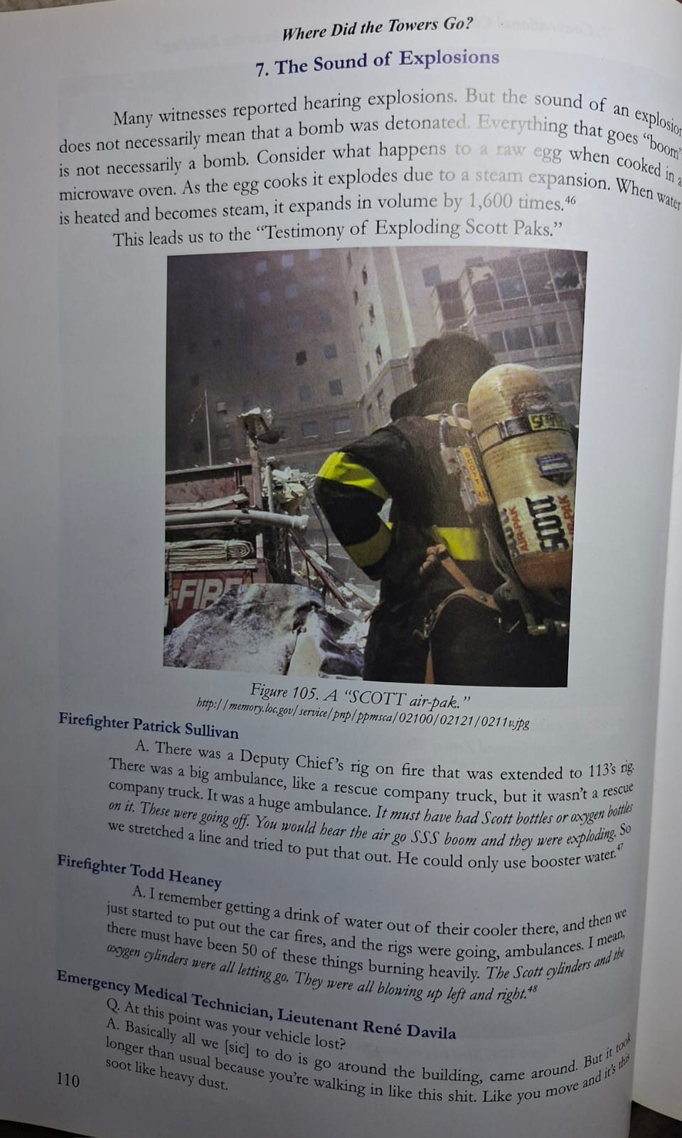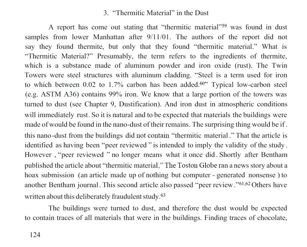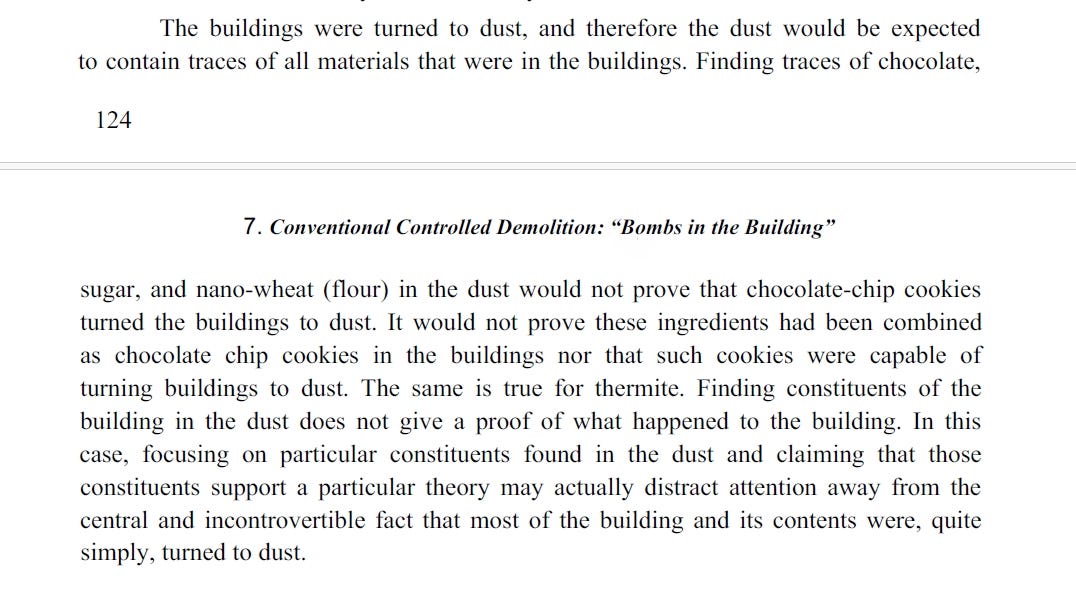 He goes on about the sounds of explosions, and states that Dr Wood is denying it, on pages 110 and 153, but when you actually go to her book, she describes what the sounds of explosions were, and that not everything that goes BOOM, is a bomb…