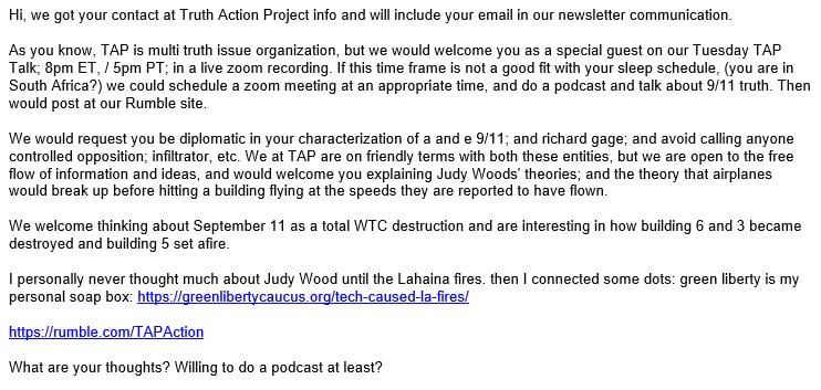 There was a presentation on “Parallels of 9/11 & Covid: Justice Around the Corner” on September 5, 2023. I was lucky to ask a 9/11 question, as the talk started at 2AM CAT, but unfortunately the answer wasn’t truthful. I was left wondering if the organisation would look into the question asked. After all, they are searching for truth, aren’t they?